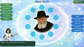 It features nigunim of the Lubavitcher Rebbe — unique spiritual melodies rooted in Hasidic tradition. Click a circle, listen to the melody, and choose the correct answer.
